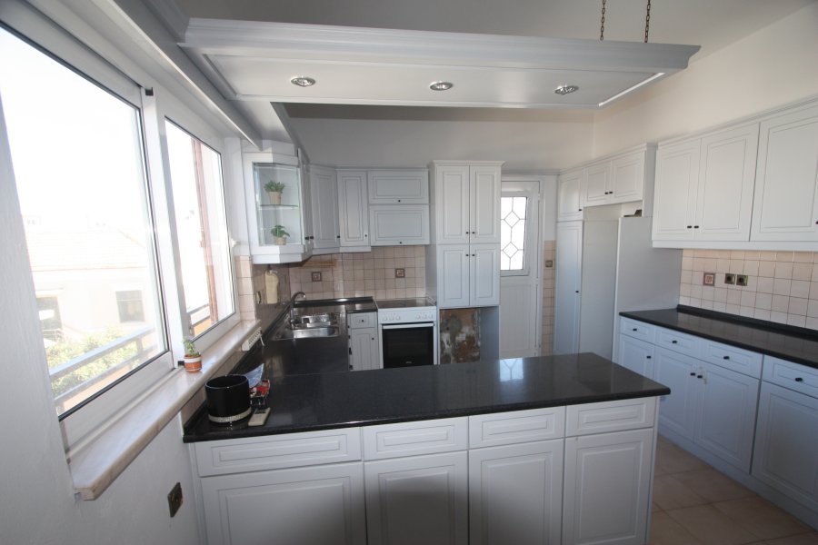 159 sq.m. second-floor apartment, consisting of a large living room, sitting area, kitchen, 3 bedrooms, and 2 bathrooms. It features air conditioning units, electric heating, and a solar water heater.